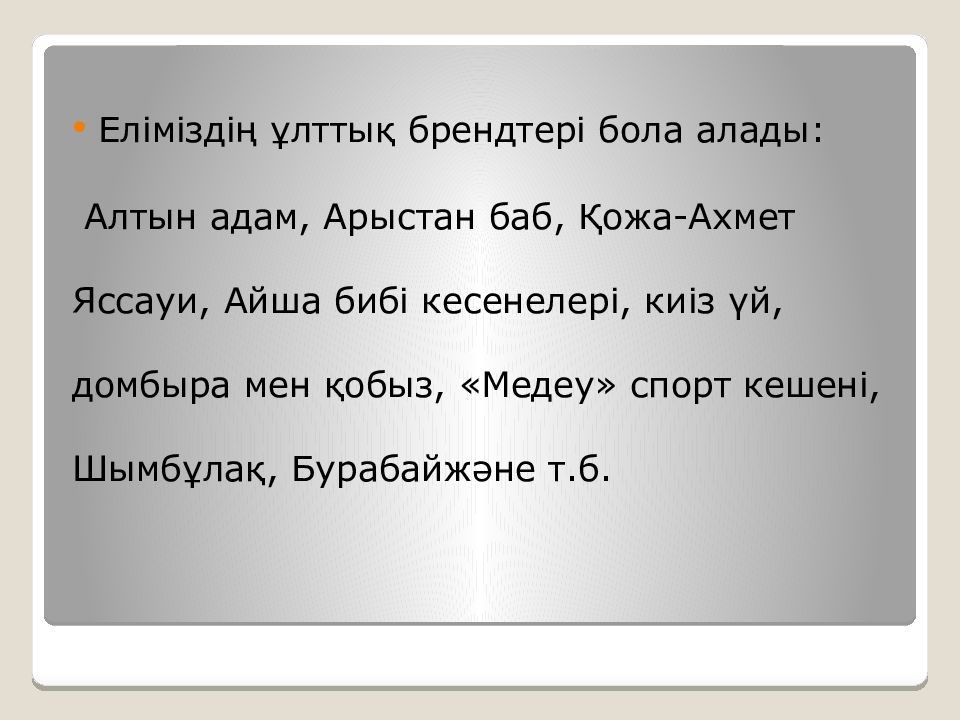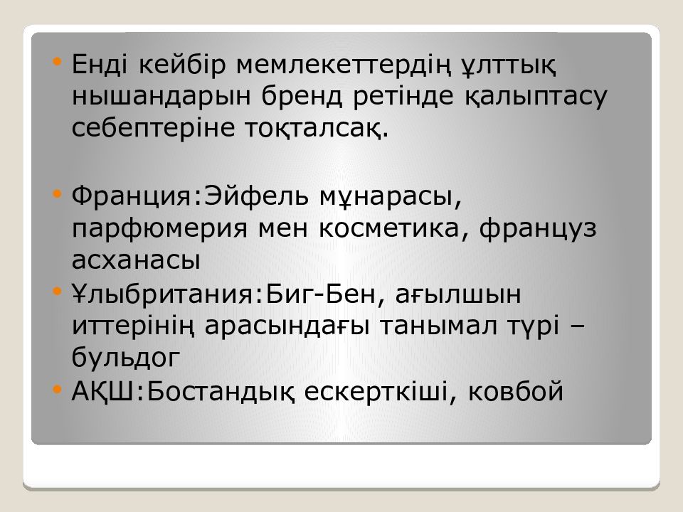 Енді кейбір мемлекеттердің ұлттық нышандарын бренд ретінде қалыптасу себептеріне тоқталсақ. Франция:Эйфель мұнарасы, парфюмерия мен косметика, француз асханасы Ұлыбритания:Биг-Бен, ағылшын иттерінің арасындағы танымал түрі – бульдог АҚШ:Бостандық ескерткіші, ковбой