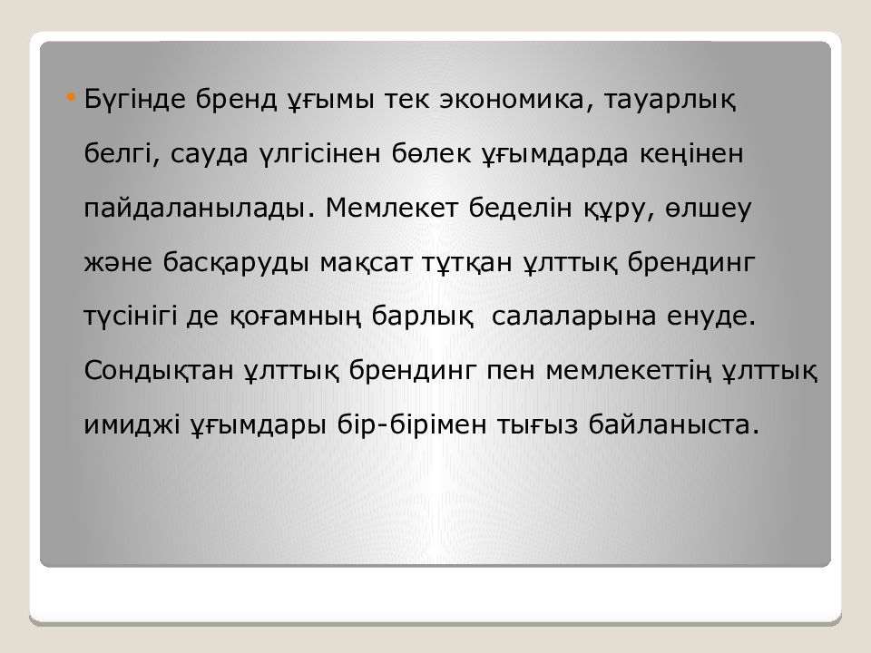 Бүгінде бренд ұғымы тек экономика, тауарлық белгі, сауда үлгісінен бөлек ұғымдарда кеңінен пайдаланылады. Мемлекет беделін құру, өлшеу және басқаруды мақсат тұтқан ұлттық брендинг түсінігі де қоғамның барлық салаларына енуде. Сондықтан ұлттық брендинг пен мемлекеттің ұлттық имиджі ұғымдары бір-бірімен тығыз байланыста.