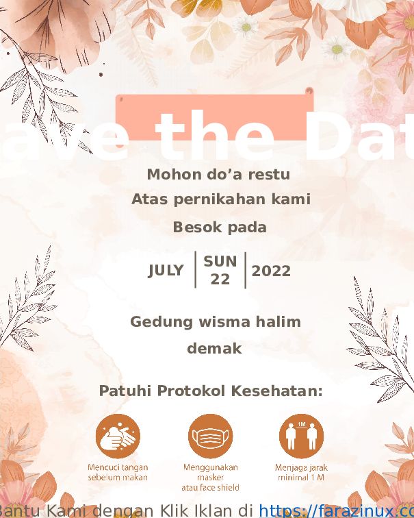 Patuhi Protokol Kesehatan: Save the Date Mohon do’a restu Atas pernikahan kami Besok pada Gedung wisma halim JULY 2022 SUN 22 demak Bantu Kami dengan Klik Iklan di https://farazinux.com