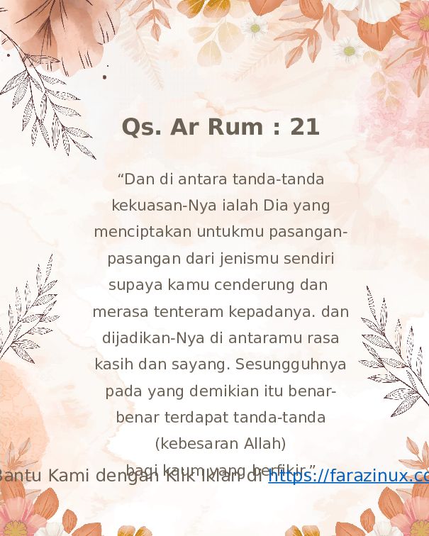Qs. Ar Rum : 21 “Dan di antara tanda-tanda kekuasan-Nya ialah Dia yang menciptakan untukmu pasangan-pasangan dari jenismu sendiri supaya kamu cenderung dan merasa tenteram kepadanya. dan dijadikan-Nya di antaramu rasa kasih dan sayang. Sesungguhnya pada yang demikian itu benar-benar terdapat tanda-tanda (kebesaran Allah) bagi kaum yang berfikir.” Bantu Kami dengan Klik Iklan di https://farazinux.com