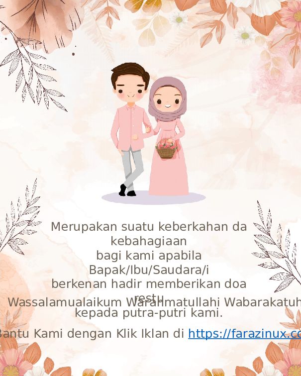 Merupakan suatu keberkahan da kebahagiaan bagi kami apabila Bapak/Ibu/Saudara/i berkenan hadir memberikan doa restu kepada putra-putri kami. Wassalamualaikum Warahmatullahi Wabarakatuh Bantu Kami dengan Klik Iklan di https://farazinux.com