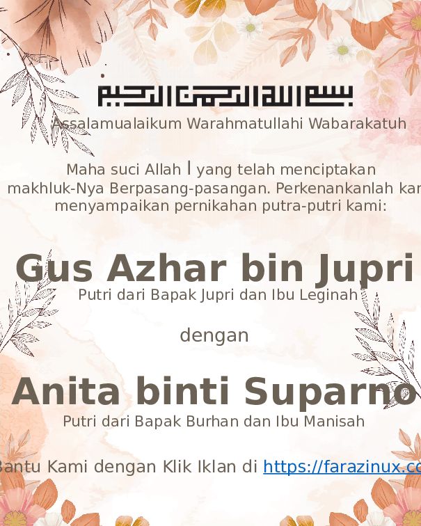 Assalamualaikum Warahmatullahi Wabarakatuh Maha suci Allah l yang telah menciptakan makhluk-Nya Berpasang-pasangan. Perkenankanlah kami menyampaikan pernikahan putra-putri kami: Gus Azhar bin Jupri Putri dari Bapak Jupri dan Ibu Leginah dengan Anita binti Suparno Putri dari Bapak Burhan dan Ibu Manisah Bantu Kami dengan Klik Iklan di https://farazinux.com
