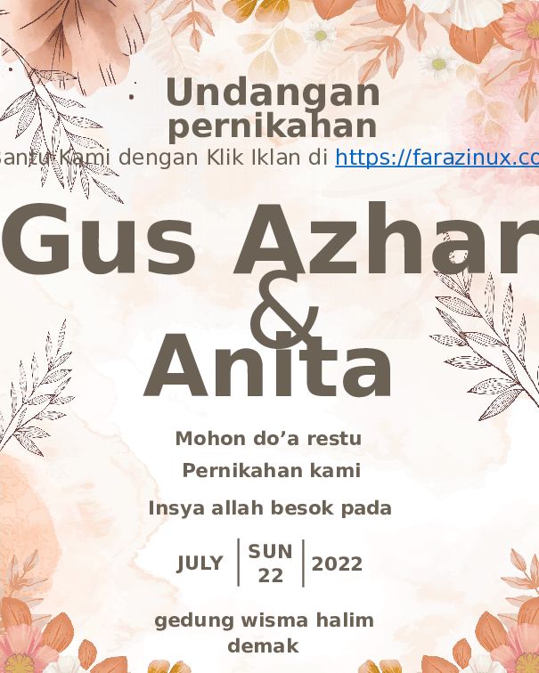 Undangan pernikahan Gus Azhar & Anita Mohon do’a restu Pernikahan kami Insya allah besok pada gedung wisma halim JULY 2022 SUN 22 demak Bantu Kami dengan Klik Iklan di https://farazinux.com