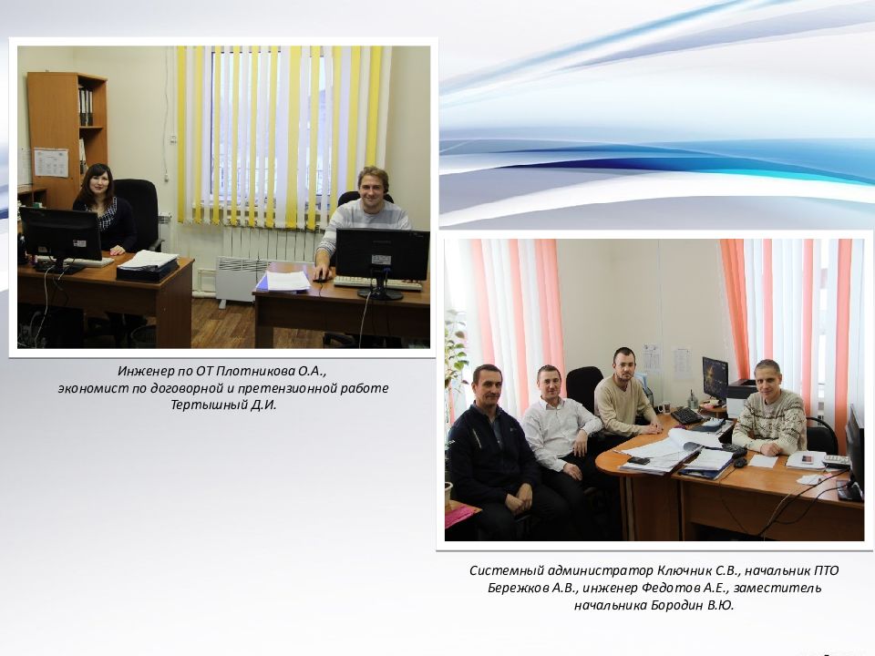 Инженер по ОТ Плотникова О.А., экономист по договорной и претензионной работе Тертышный Д.И. Системный администратор Ключник С.В., начальник ПТО Бережков А.В., инженер Федотов А.Е., заместитель начальника Бородин В.Ю.