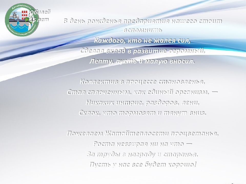 В день рожденья предприятия нашего стоит вспомнить Каждого, кто не жалея сил, Сделал вклад в развитие огромный, Лепту, пусть и малую вносил. Коллектив в процессе становленья, Стал сплоченным, как единый организм, — Никаких интриг, раздоров, лени, Склок, что тормозят и тянут вниз. Пожелаем Жатайтеплосети процветанья, Роста невзирая ни на что — За труды в награду и старанья. Пусть у нас все будет хорошо! Юбилей 15 лет