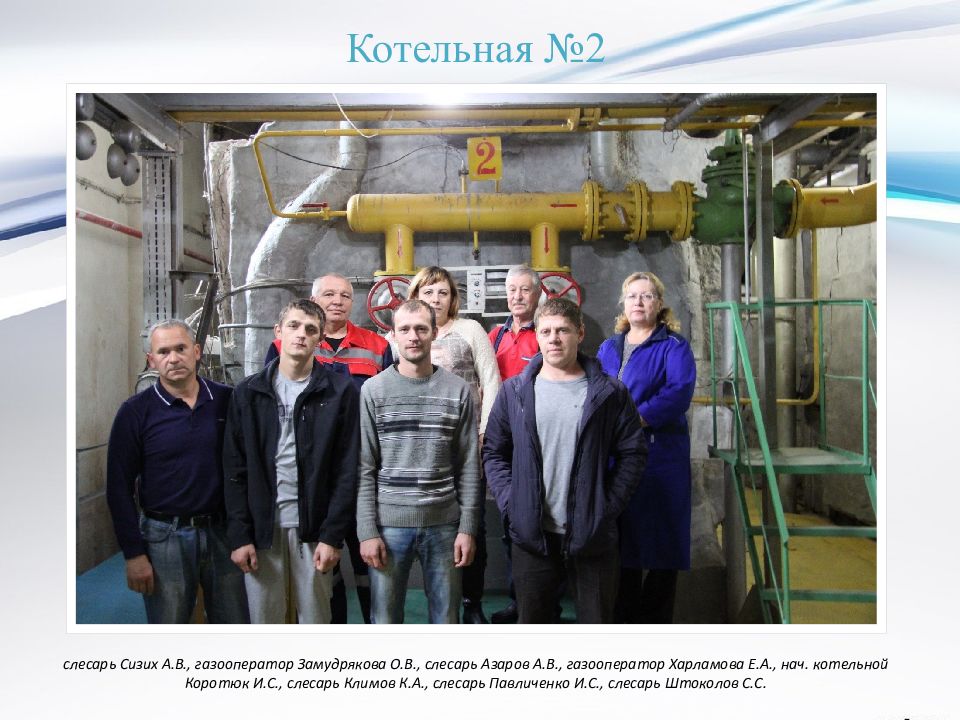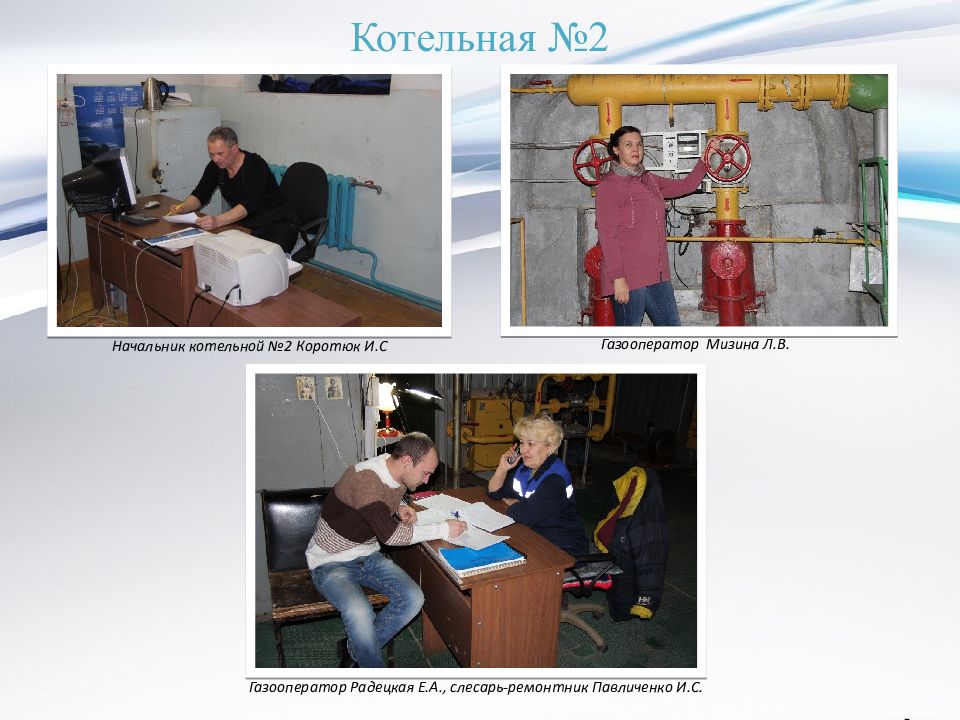 Котельная №2 Начальник котельной №2 Коротюк И.С Газооператор Радецкая Е.А., слесарь-ремонтник Павличенко И.С. Газооператор Мизина Л.В.