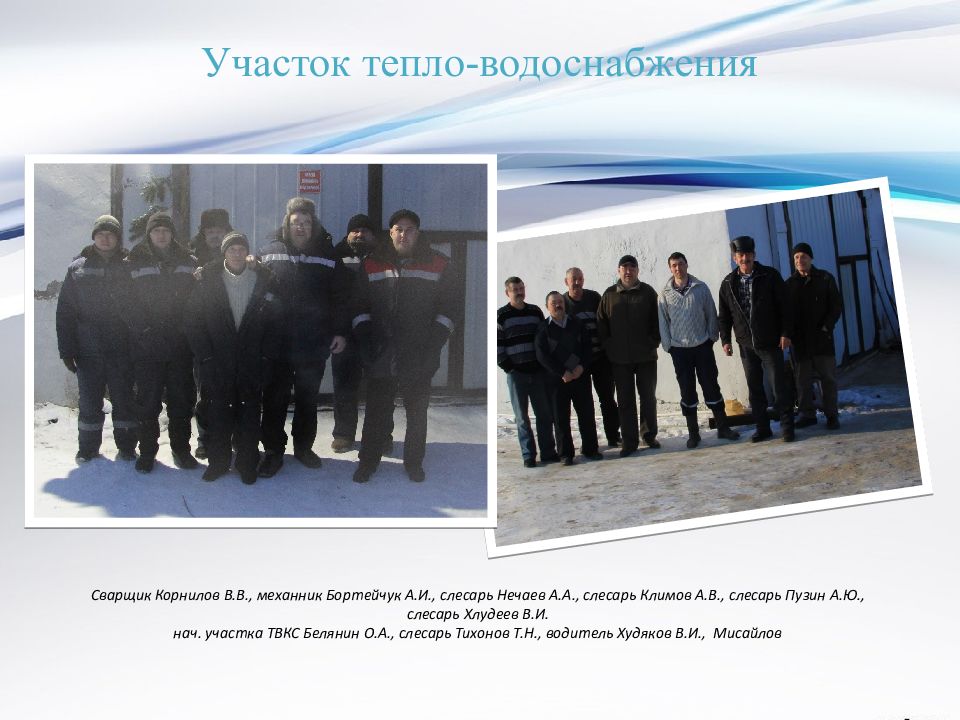 Участок тепло-водоснабжения Сварщик Корнилов В.В., механник Бортейчук А.И., слесарь Нечаев А.А., слесарь Климов А.В., слесарь Пузин А.Ю., слесарь Хлудеев В.И. н ач. участка ТВКС Белянин О.А., слесарь Тихонов Т.Н., водитель Худяков В.И., Мисайлов