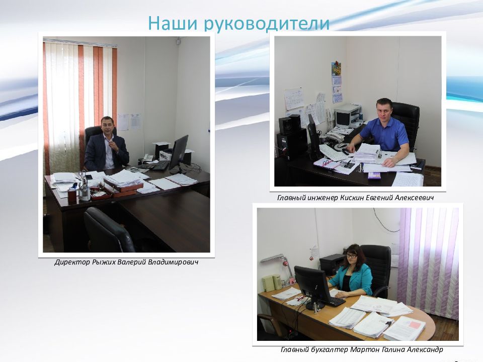 Директор Рыжих Валерий Владимирович Главный бухгалтер Мартон Галина Александр Главный инженер Кискин Евгений Алексеевич