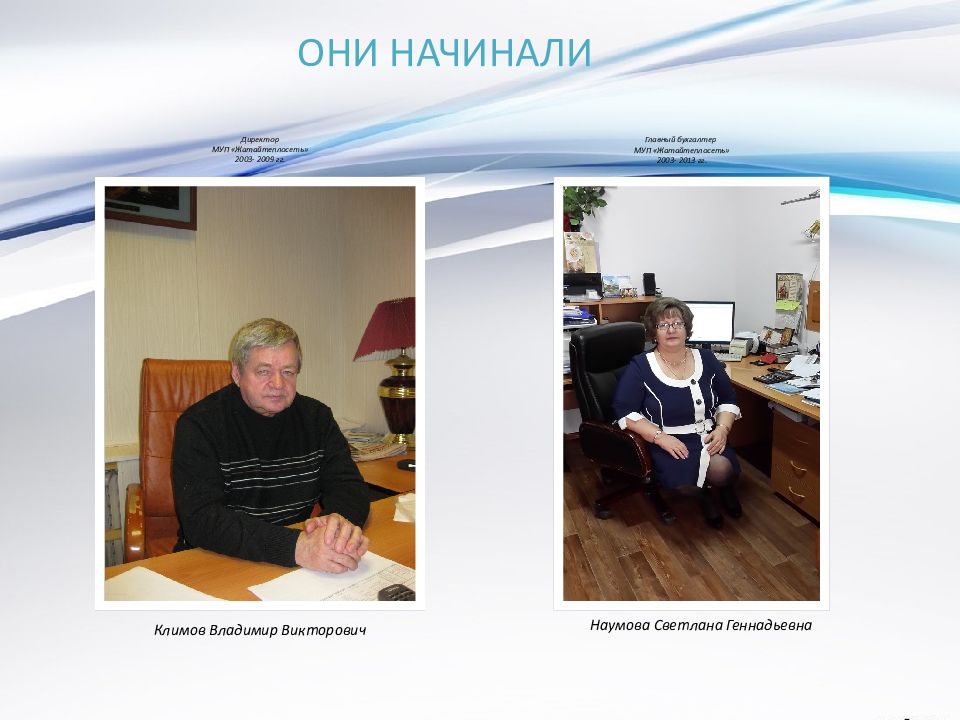 Главный бухгалтер МУП «Жатайтеплосеть» 2003- 2013 гг. Климов Владимир Викторович Наумова Светлана Геннадьевна Директор МУП «Жатайтеплосеть» 2003- 2009 гг.