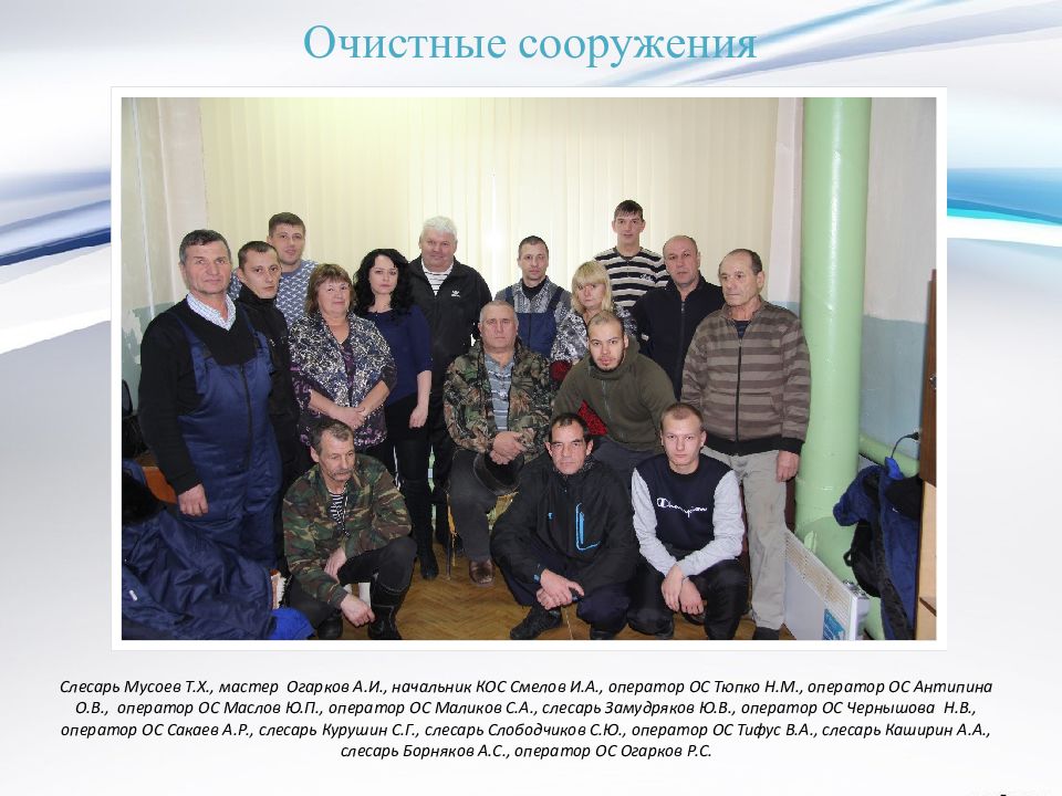 Очистные сооружения Слесарь Мусоев Т.Х., мастер Огарков А.И., начальник КОС Смелов И.А., оператор ОС Тюпко Н.М., оператор ОС Антипина О.В., оператор ОС Маслов Ю.П., оператор ОС Маликов С.А., слесарь Замудряков Ю.В., оператор ОС Чернышова Н.В., оператор ОС Сакаев А.Р., слесарь Курушин С.Г., слесарь Слободчиков С.Ю., оператор ОС Тифус В.А., слесарь Каширин А.А., слесарь Борняков А.С., оператор ОС Огарков Р.С.