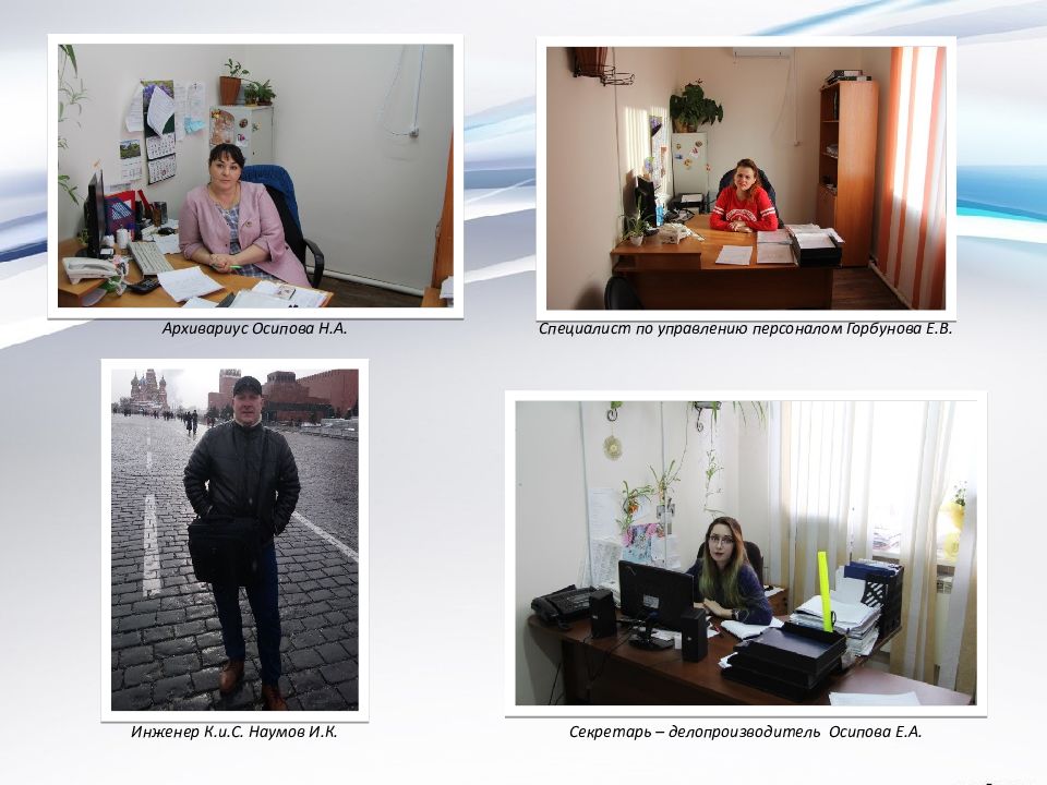 Специалист по управлению персоналом Горбунова Е.В. Секретарь – делопроизводитель Осипова Е.А. Архивариус Осипова Н.А. Инженер К. и. С. Наумов И.К.