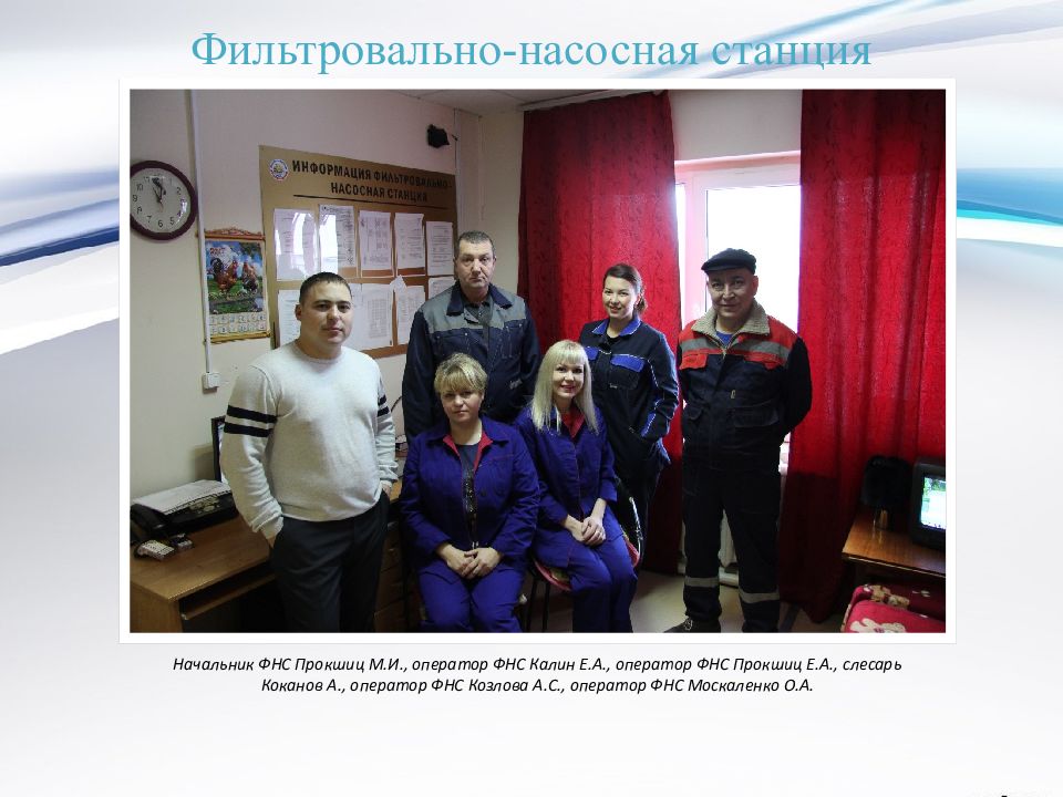 Фильтровально-насосная станция Начальник ФНС Прокшиц М.И., оператор ФНС Калин Е.А., оператор ФНС Прокшиц Е.А., слесарь Коканов А., оператор ФНС Козлова А.С., оператор ФНС Москаленко О.А.