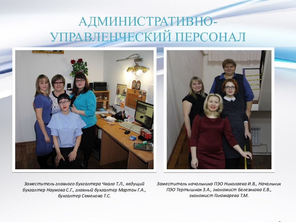 Заместитель главного бухгалтера Чвала Т.Л., ведущий бухгалтер Наумова С.Г., главный бухгалтер Мартон Г.А., бухгалтер Семенова Т.С. Заместитель начальника ПЭО Николаева И.В., Начальник ПЭО Тертышная З.А., экономист Белезякова Е.В., экономист Голомарева Т.М.