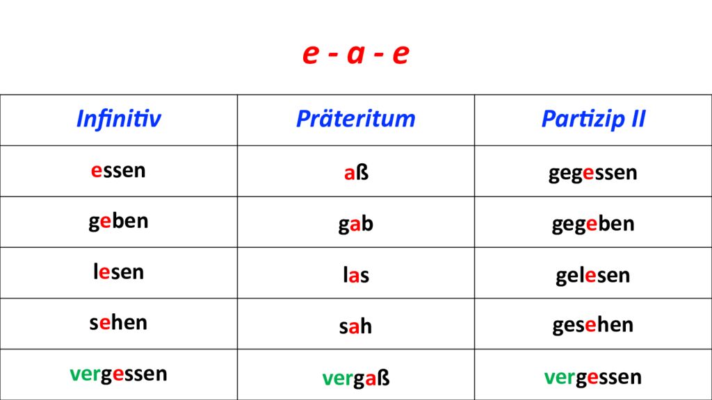 e - a - e Infinitiv Präteritum Partizip II e ssen g e ben l e sen s e hen ver g e ssen a ß geg e ssen g a b geg e ben l a s gel e sen s a h ges e hen ver g a ß ver g e ssen