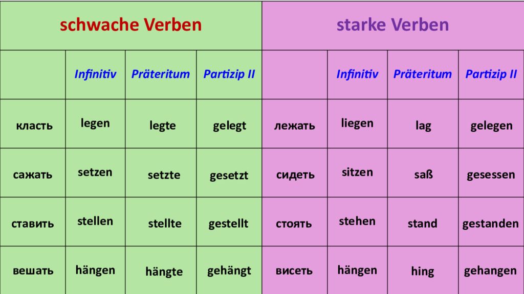 schwache Verben starke Verben Infinitiv Präteritum Partizip II Infinitiv Präteritum Partizip II legen liegen setzen sitzen stellen stehen hängen hängen класть сажать ставить вешать gelegt gesetzt gestellt gehängt лежать сидеть стоять висеть gelegen gesessen gestanden gehangen legte setzte stellte hängte lag saß stand hing
