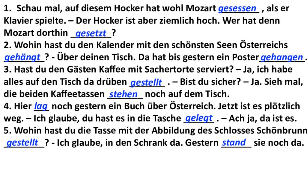 Schau mal, auf diesem Hocker hat wohl Mozart ________, als er Klavier spielte. – Der Hocker ist aber ziemlich hoch. Wer hat denn Mozart dorthin ________? 2. Wohin hast du den Kalender mit den schönsten Seen Österreichs ________? - Über deinen Tisch. Da hat bis gestern ein Poster_________. 3. Hast du den Gästen Kaffee mit Sachertorte serviert? – Ja, ich habe alles auf den Tisch da drüben _______. – Bist du sicher? – Ja. Sieh mal, die beiden Kaffeetassen _______ noch auf dem Tisch. 4. Hier ___ noch gestern ein Buch über Österreich. Jetzt ist es plötzlich weg. – Ich glaube, du hast es in die Tasche ______. – Ach ja, da ist es. 5. Wohin hast du die Tasse mit der Abbildung des Schlosses Schönbrunn ________? - Ich glaube, in den Schrank da. Gestern ______ sie noch da. gesessen gesetzt gehängt gehangen gestellt stehen lag gelegt gestellt stand