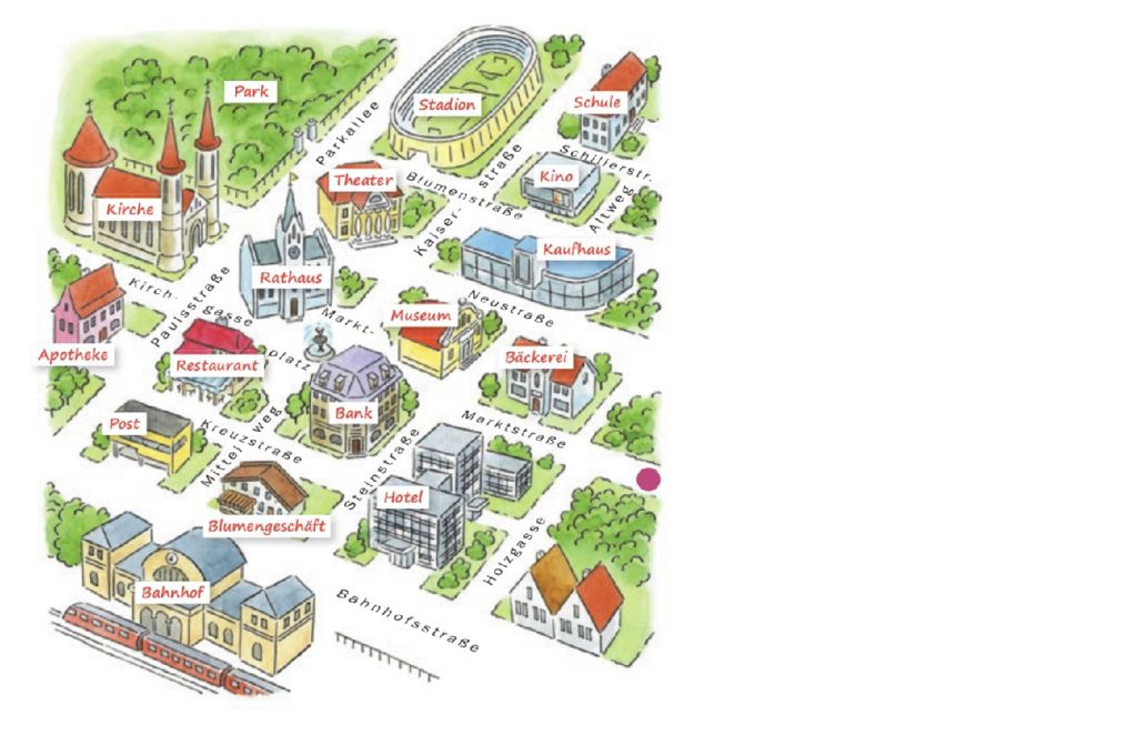 mit dem Bus mit dem Auto mit der U- Bahn mit der S- Bahn mit der Stra ß enbahn fahren nach links nach rechts gehen, fahren zu m Bahnhof zu r Apotheke zu r Schule gehen, fahren (nicht) weit von hier. Das ist ( liegt ) на автобусе, на машине, на метро, на поезде, на трамвае на лево, на право на вокзал, в аптеку, в школу (не) далеко от сюда. ехать идти, ехать идти, ехать Это располагается