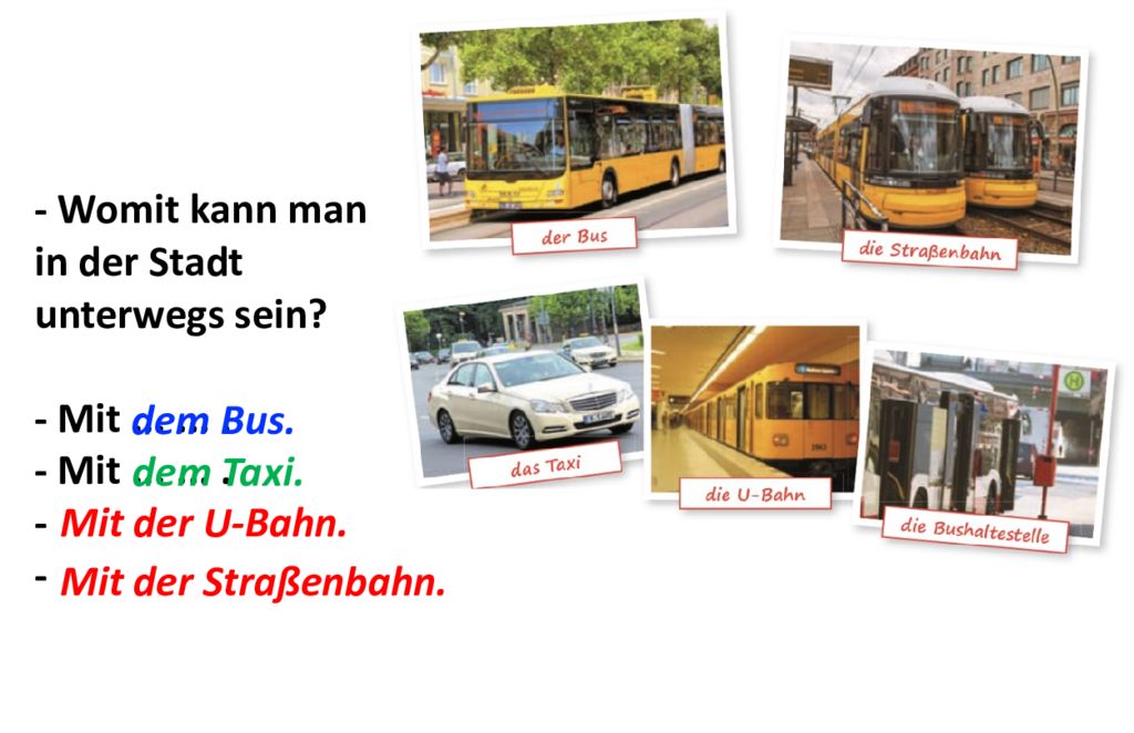 - Womit kann man in der Stadt unterwegs sein? - Mit....... - Mit....... -.......... -.......... dem Bus. dem Taxi. Mit der U-Bahn. Mit der Straßenbahn.