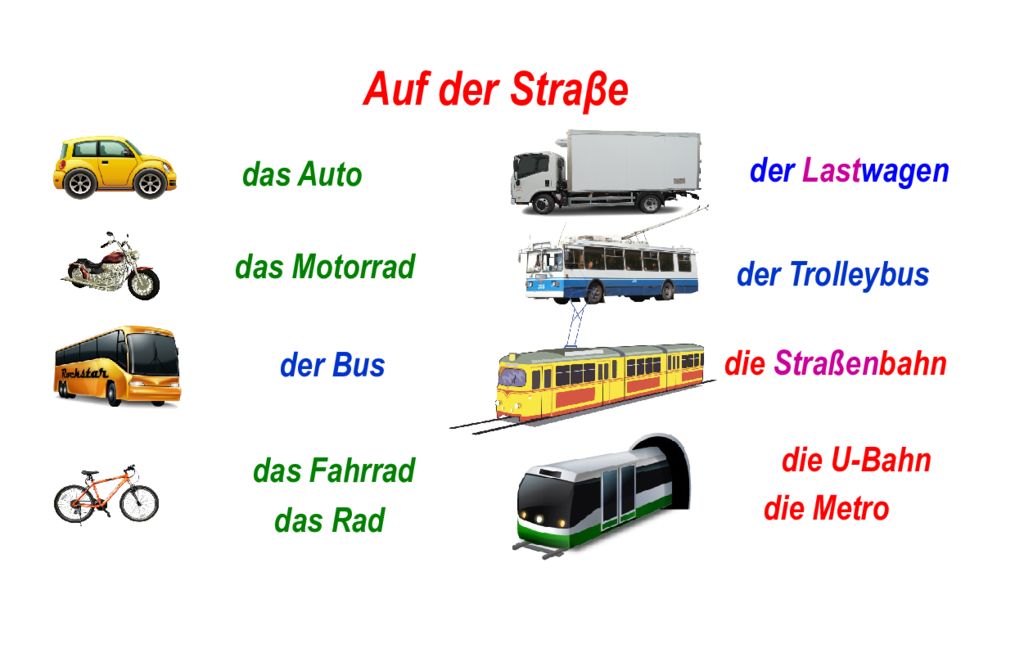 das Auto das Motorrad der Bus das Fahrrad das Rad der Last wagen der Trolleybus die Straßen bahn die U-Bahn die Metro