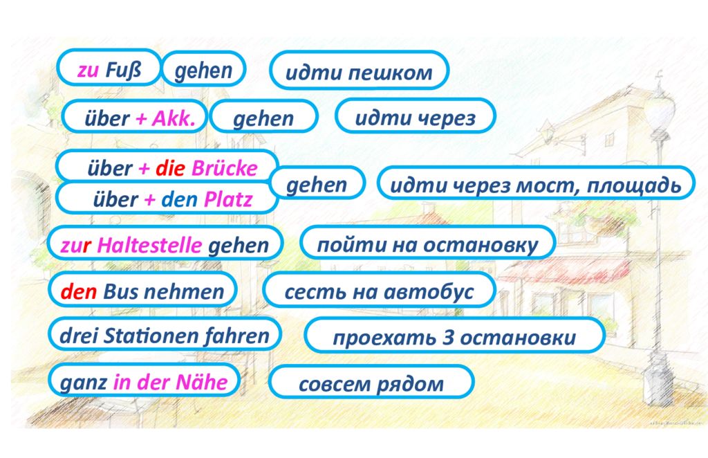 über + Akk. z u r Haltestelle gehen drei Stationen fahren den Bus nehmen идти через мост, площадь пойти на остановку сесть на автобус проехать 3 остановки ganz in der Nähe совсем рядом zu Fuß gehen идти пешком gehen идти через über + die Brücke über + den Platz gehen