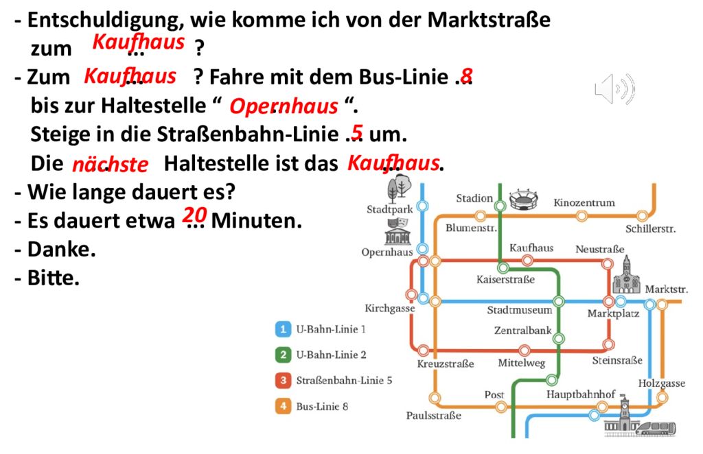 - Entschuldigung, wie komme ich von der Marktstraße zum... ? - Zum... ? Fahre mit dem Bus-Linie... bis zur Haltestelle “... “. Steige in die Straßenbahn-Linie... um. Die... Haltestelle ist das.... - Wie lange dauert es? - Es dauert etwa... Minuten. - Danke. - Bitte. Kaufhaus Kaufhaus 8 Opernhaus 5 nächste Kaufhaus 20