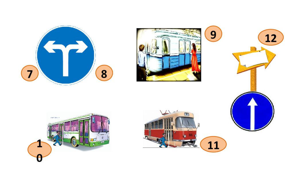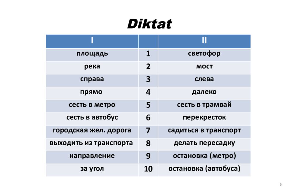 5 I II площадь 1 светофор река 2 мост справа 3 слева прямо 4 далеко сесть в метро 5 сесть в трамвай сесть в автобус 6 перекресток городская жел. дорога 7 садиться в транспорт выходить из транспорта 8 делать пересадку направление 9 остановка (метро) за угол 10 остановка (автобуса)