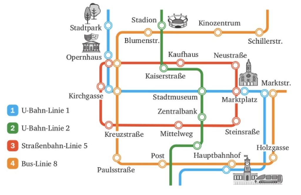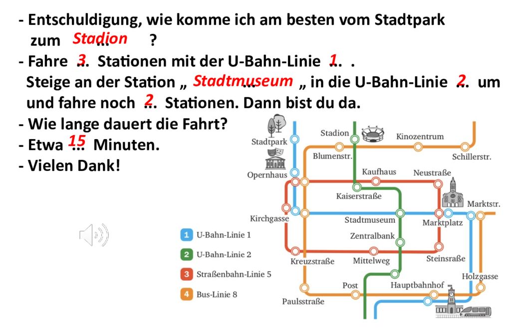Stadion 3 1 Stadtmuseum 2 2 15 - Entschuldigung, wie komme ich am besten vom Stadtpark zum... ? - Fahre... Stationen mit der U-Bahn-Linie.... Steige an der Station „... „ in die U-Bahn-Linie... um und fahre noch... Stationen. Dann bist du da. - Wie lange dauert die Fahrt? - Etwa... Minuten. - Vielen Dank!