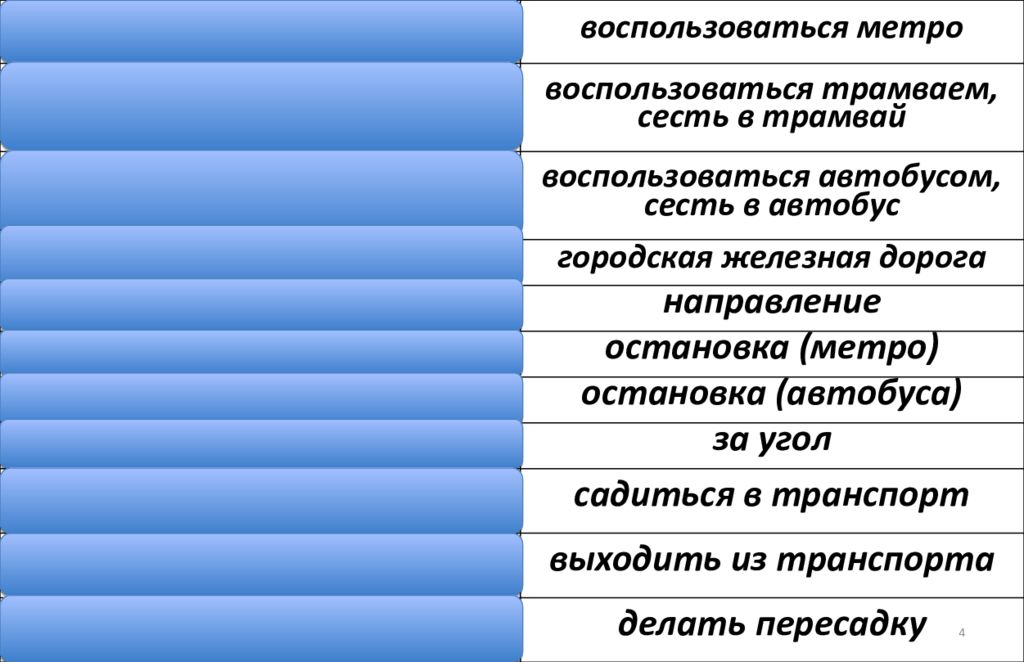 die U-Bahn nehmen воспользоваться метро die Straßen bahn nehmen воспользоваться трамваем, сесть в трамвай den Bus nehmen воспользоваться автобусом, сесть в автобус die S-Bahn городская железная дорога die Richtung направление die Station (en) остановка (метро) die Halte stelle (n) остановка (автобуса) um die Ecke за угол ein steigen (stieg ein, ist ein gestiegen) садиться в транспорт aus steigen (stieg aus, ist aus gestiegen) выходить из транспорта um steigen (stieg um, ist um gestiegen) делать пересадку 4
