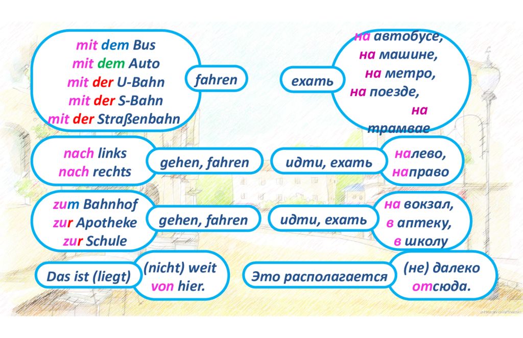 mit dem Bus mit dem Auto mit der U- Bahn mit der S- Bahn mit der Stra ß enbahn fahren nach links nach rechts gehen, fahren zu m Bahnhof zu r Apotheke zu r Schule gehen, fahren (nicht) weit von hier. Das ist ( liegt ) на автобусе, на машине, на метро, на поезде, на трамвае на лево, на право на вокзал, в аптеку, в школу (не) далеко от сюда. ехать идти, ехать идти, ехать Это располагается