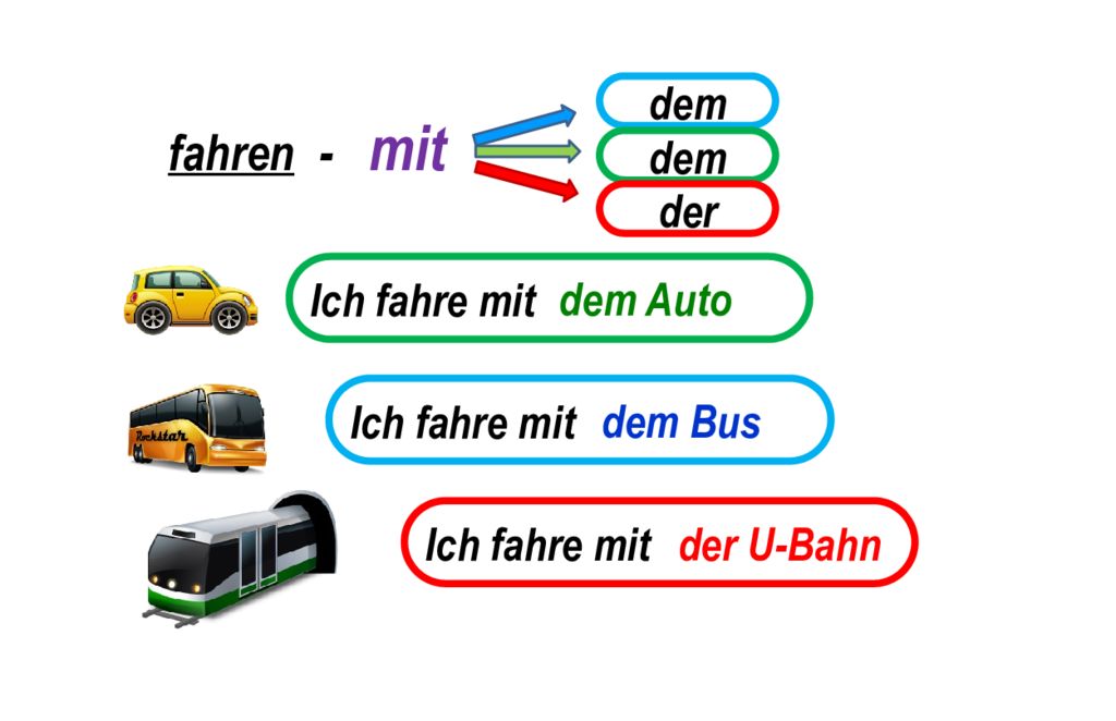 dem dem der Ich fahre mit dem Auto Ich fahre mit dem Bus Ich fahre mit der U-Bahn
