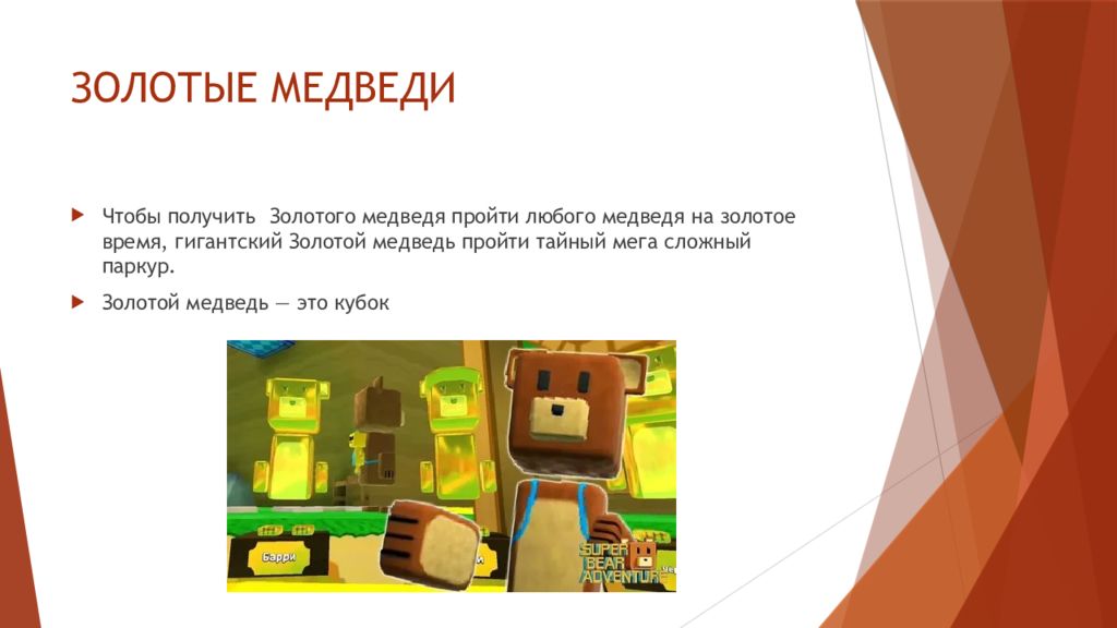 Чтобы получить Золотого медведя пройти любого медведя на золотое время, гигантский Золотой медведь пройти тайный мега сложный паркур. Золотой медведь — это кубок