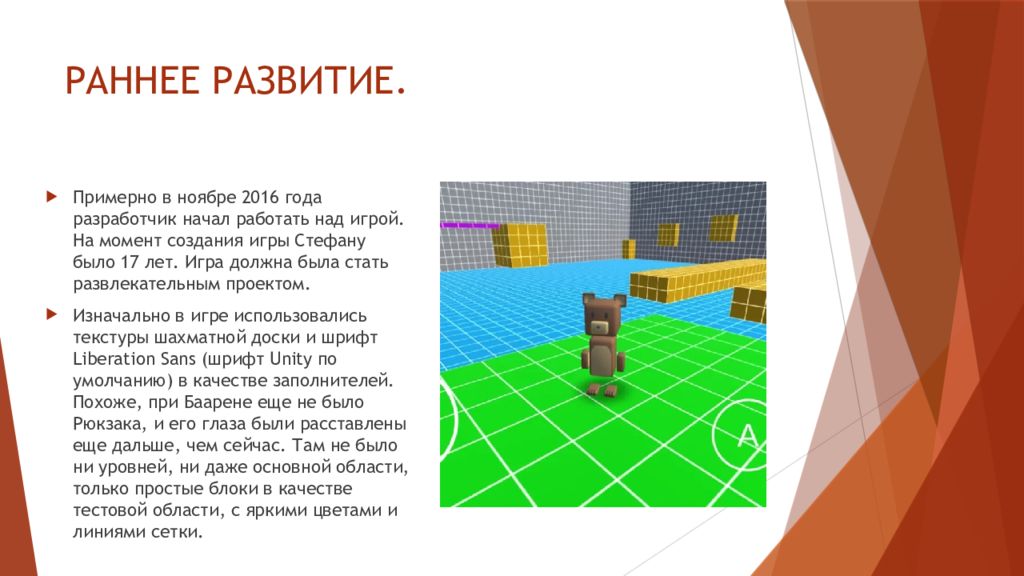 Примерно в ноябре 2016 года разработчик начал работать над игрой. На момент создания игры Стефану было 17 лет. Игра должна была стать развлекательным проектом. Изначально в игре использовались текстуры шахматной доски и шрифт Liberation Sans (шрифт Unity по умолчанию) в качестве заполнителей. Похоже, при Баарене еще не было Рюкзака, и его глаза были расставлены еще дальше, чем сейчас. Там не было ни уровней, ни даже основной области, только простые блоки в качестве тестовой области, с яркими цветами и линиями сетки.