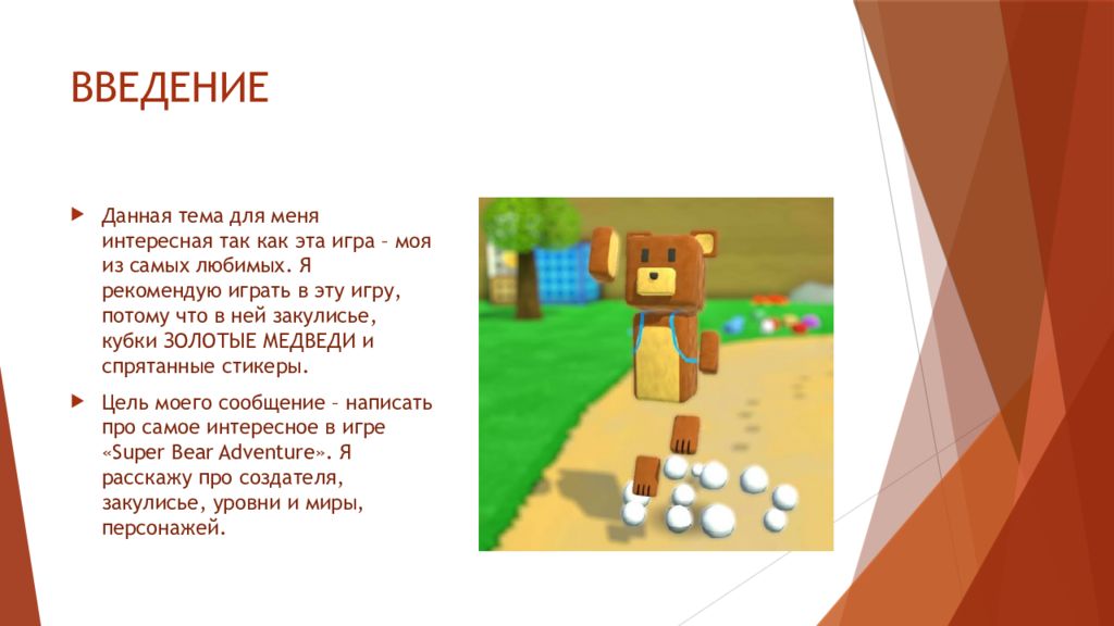 Данная тема для меня интересная так как эта игра – моя из самых любимых. Я рекомендую играть в эту игру, потому что в ней закулисье, кубки ЗОЛОТЫЕ МЕДВЕДИ и спрятанные стикеры. Цель моего сообщение – написать про самое интересное в игре «Super Bear Adventure». Я расскажу про создателя, закулисье, уровни и миры, персонажей.