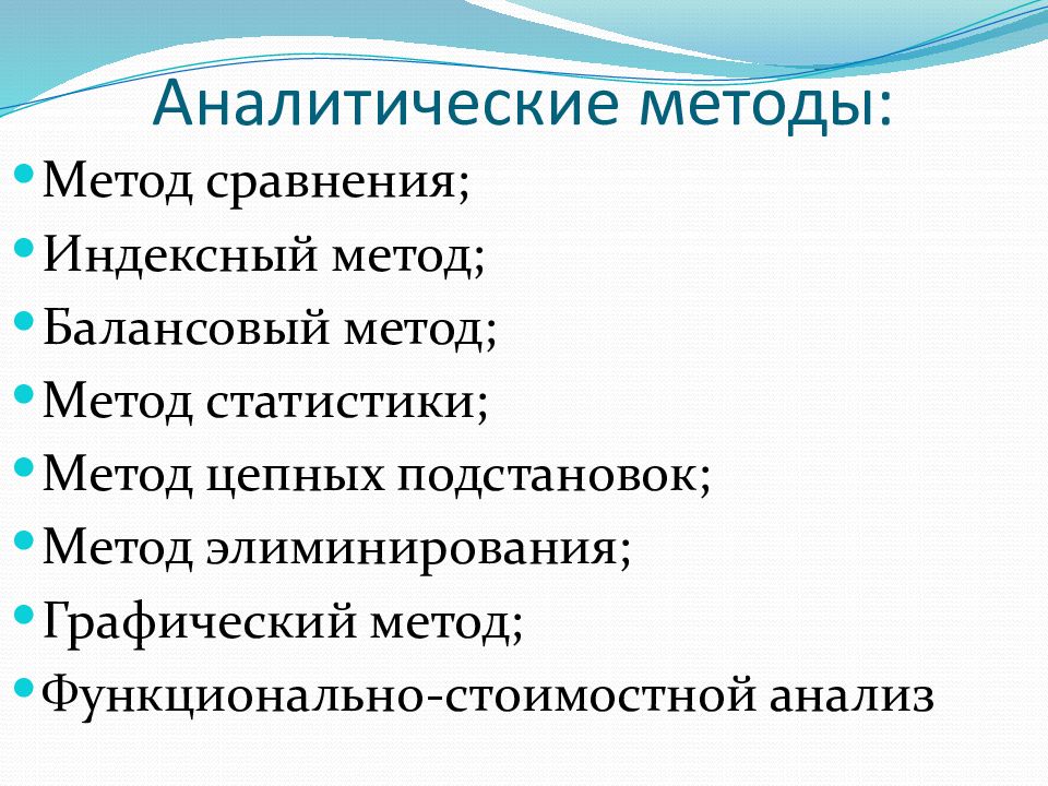 Метод сравнения; Индексный метод; Балансовый метод; Метод статистики; Метод цепных подстановок; Метод элиминирования; Графический метод; Функционально-стоимостной анализ