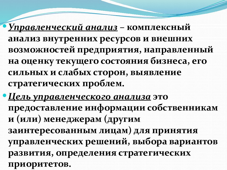 Управленческий анализ – комплексный анализ внутренних ресурсов и внешних возможностей предприятия, направленный на оценку текущего состояния бизнеса, его сильных и слабых сторон, выявление стратегических проблем. Цель управленческого анализа это предоставление информации собственникам и (или) менеджерам (другим заинтересованным лицам) для принятия управленческих решений, выбора вариантов развития, определения стратегических приоритетов.