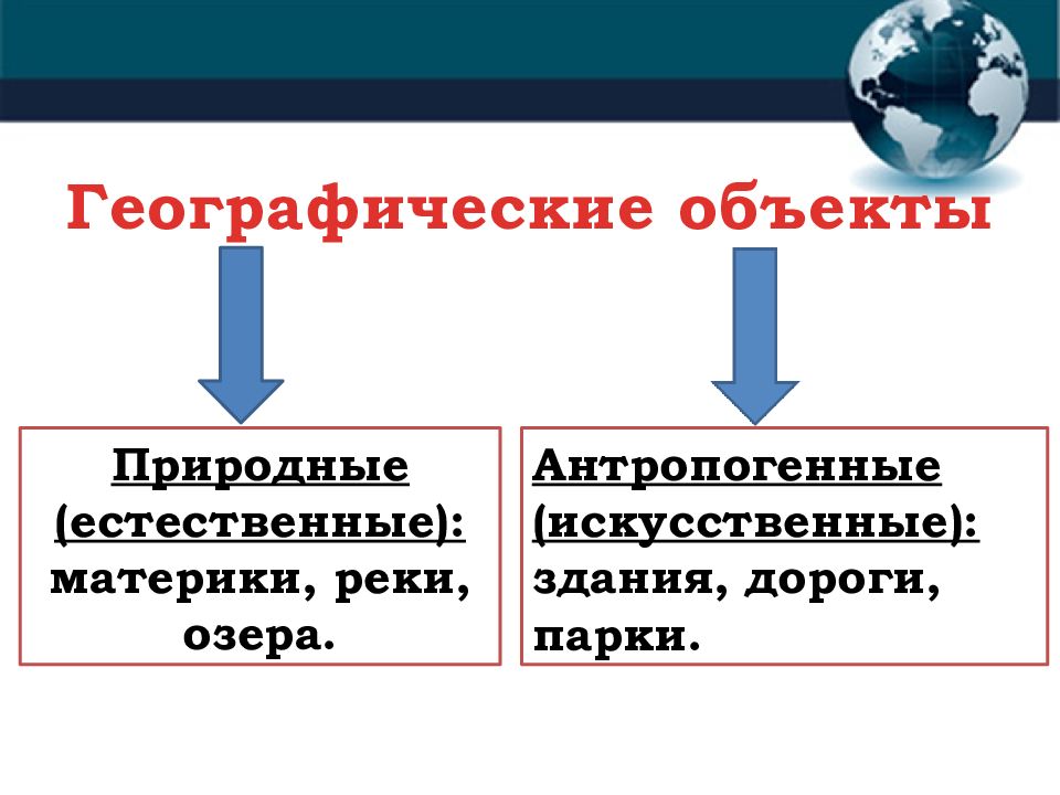 Географические объекты Природные (естественные): материки, реки, озера. Антропогенные (искусственные): здания, дороги, парки.