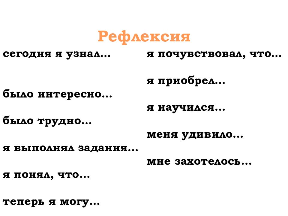Рефлексия сегодня я узнал … было интересно… было трудно… я выполнял задания… я понял, что… теперь я могу… я почувствовал, что… я приобрел… я научился… меня удивило… мне захотелось…