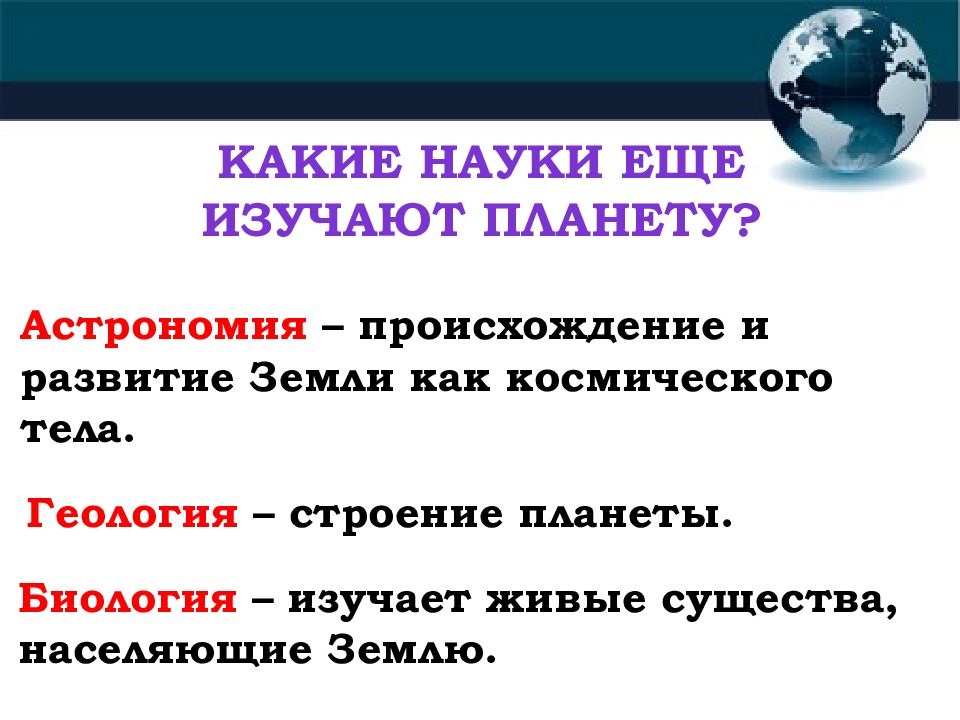 Какие науки еще изучают планету? Астрономия – происхождение и развитие Земли как космического тела. Геология – строение планеты. Биология – изучает живые существа, населяющие Землю.