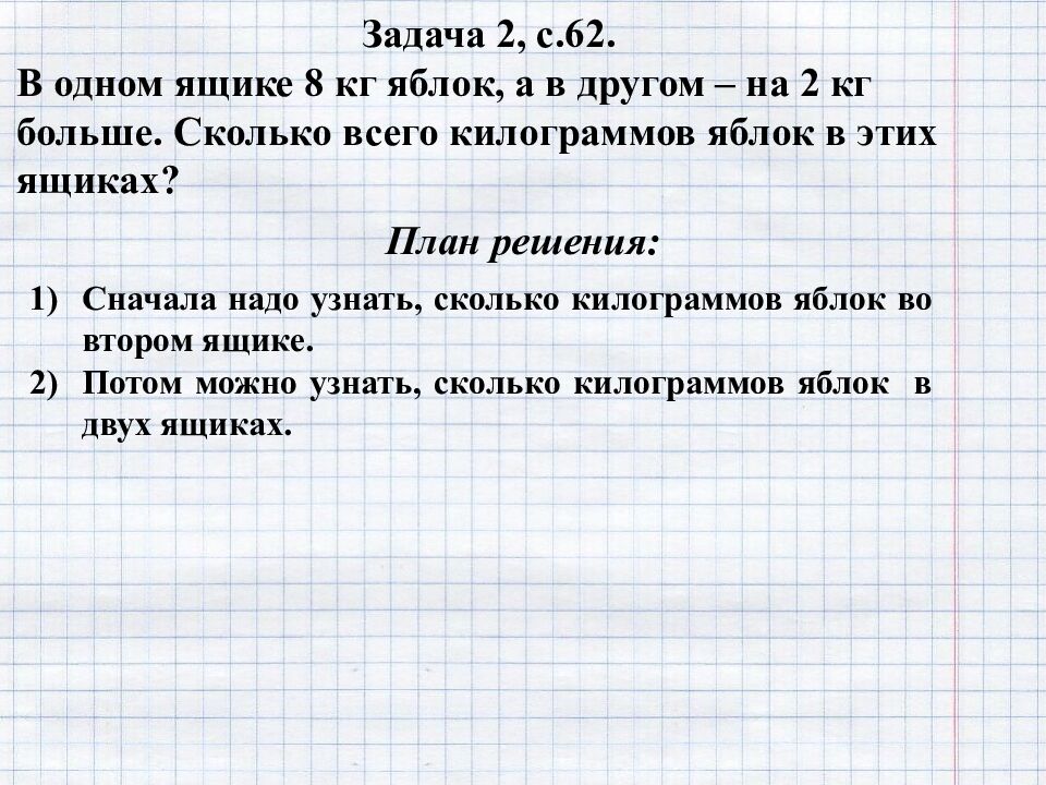 Задача 2, с.62. В одном ящике 8 кг яблок, а в другом – на 2 кг больше. Сколько всего килограммов яблок в этих ящиках? План решения: Сначала надо узнать, сколько килограммов яблок во втором ящике. Потом можно узнать, сколько килограммов яблок в двух ящиках.
