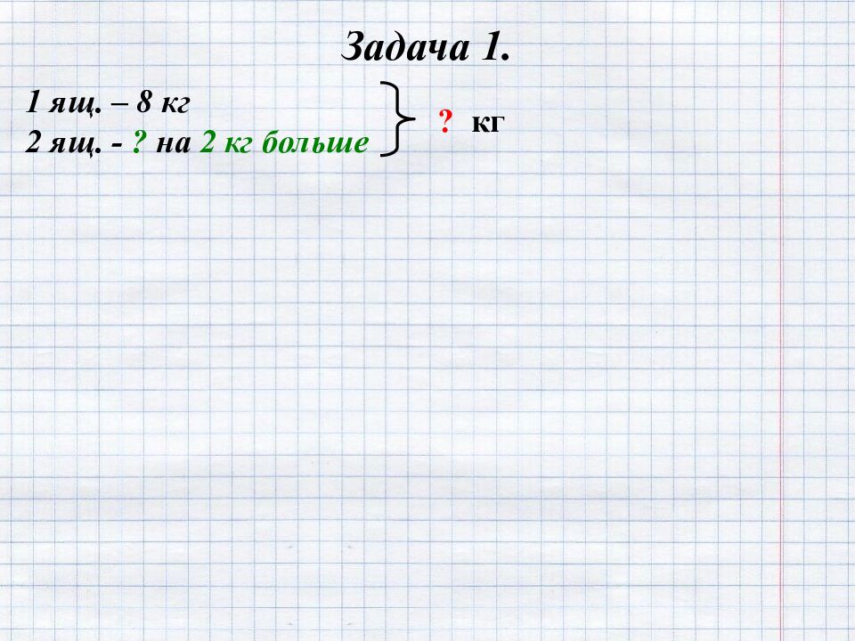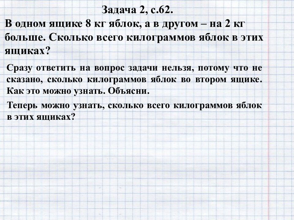 Задача 2, с.62. В одном ящике 8 кг яблок, а в другом – на 2 кг больше. Сколько всего килограммов яблок в этих ящиках? Сразу ответить на вопрос задачи нельзя, потому что не сказано, сколько килограммов яблок во втором ящике. Как это можно узнать. Объясни. Теперь можно узнать, сколько всего килограммов яблок в этих ящиках?