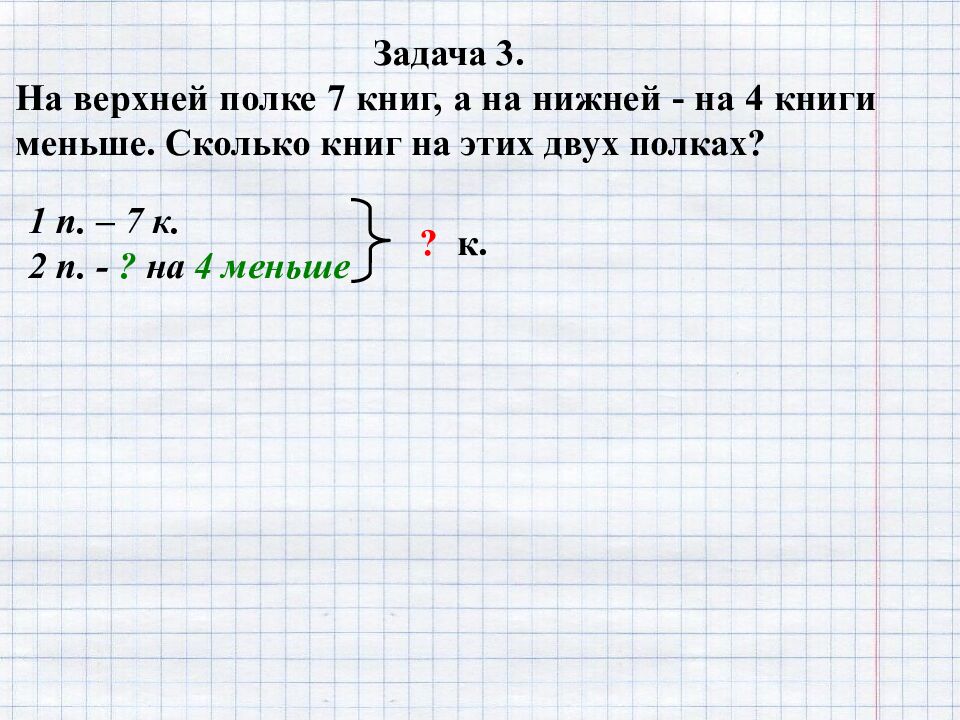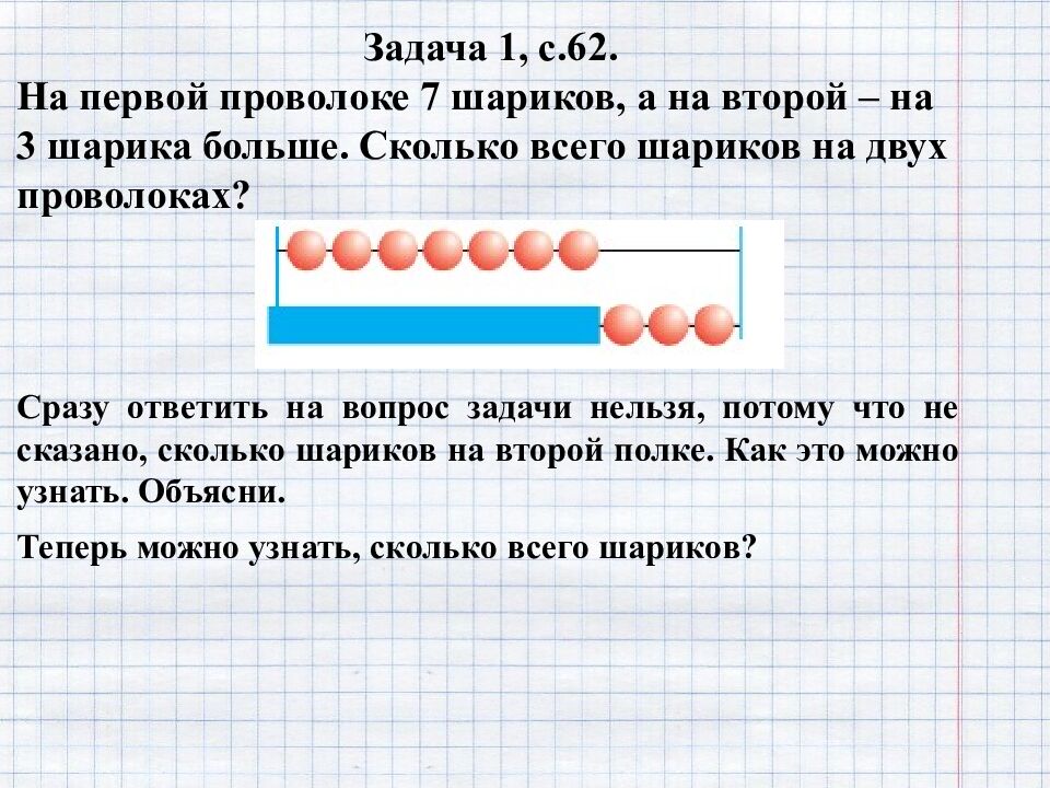 Задача 1, с.62. На первой проволоке 7 шариков, а на второй – на 3 шарика больше. Сколько всего шариков на двух проволоках? Сразу ответить на вопрос задачи нельзя, потому что не сказано, сколько шариков на второй полке. Как это можно узнать. Объясни. Теперь можно узнать, сколько всего шариков?