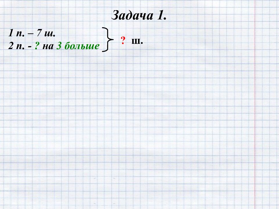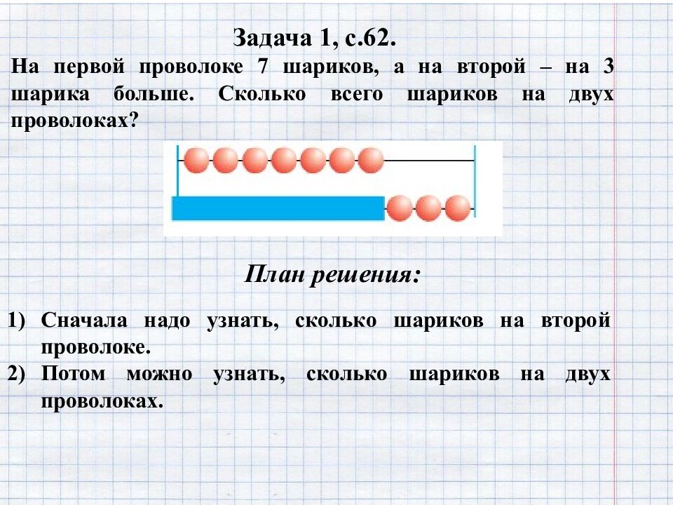 Задача 1, с.62. На первой проволоке 7 шариков, а на второй – на 3 шарика больше. Сколько всего шариков на двух проволоках? Сначала надо узнать, сколько шариков на второй проволоке. Потом можно узнать, сколько шариков на двух проволоках. План решения: