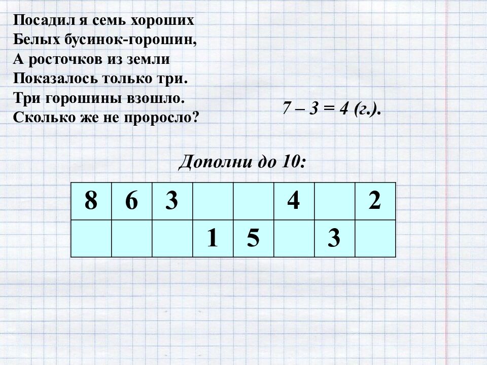 Посадил я семь хороших Белых бусинок-горошин, А росточков из земли Показалось только три. Три горошины взошло. Сколько же не проросло? 7 – 3 = 4 (г.). Дополни до 10: 8 6 3 4 2 1 5 3