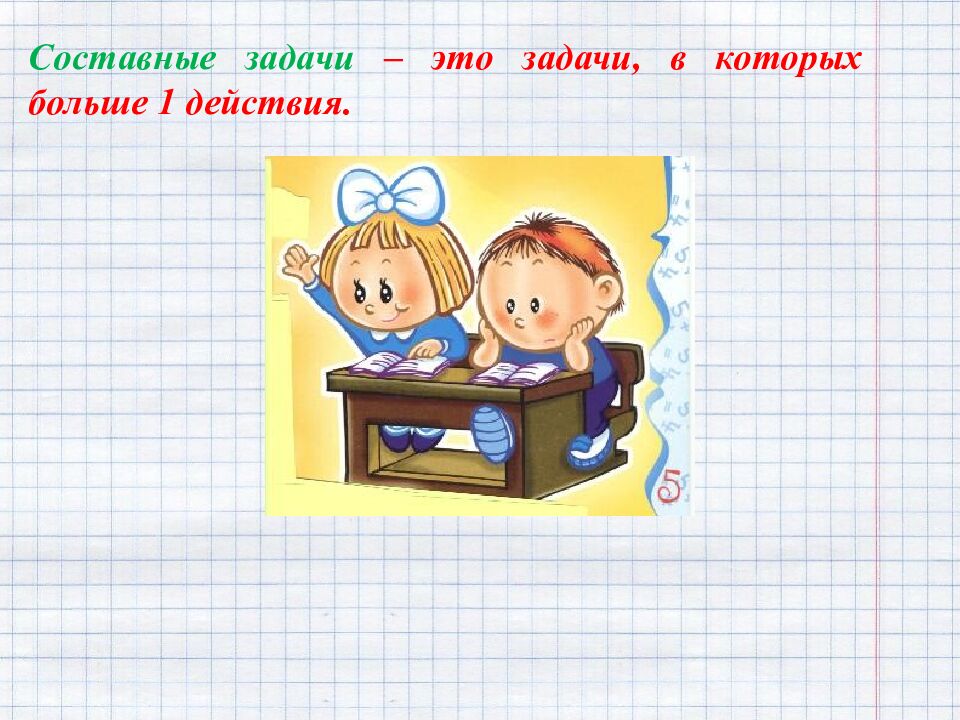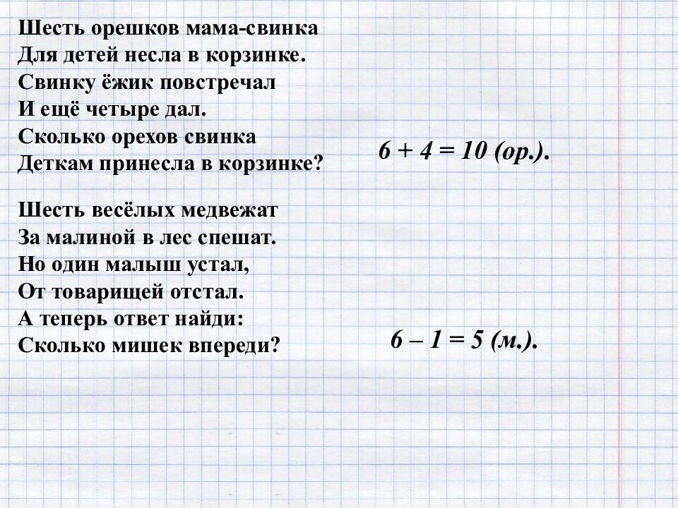 Шесть орешков мама-свинка Для детей несла в корзинке. Свинку ёжик повстречал И ещё четыре дал. Сколько орехов свинка Деткам принесла в корзинке? 6 + 4 = 10 (ор.). Шесть весёлых медвежат За малиной в лес спешат. Но один малыш устал, От товарищей отстал. А теперь ответ найди: Сколько мишек впереди? 6 – 1 = 5 (м.).