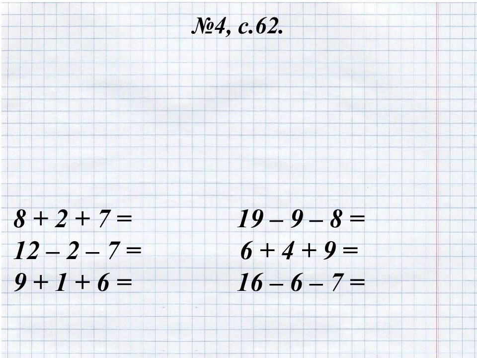 8 + 2 + 7 = 19 – 9 – 8 = 12 – 2 – 7 = 6 + 4 + 9 = 9 + 1 + 6 = 16 – 6 – 7 = №4, с.62.