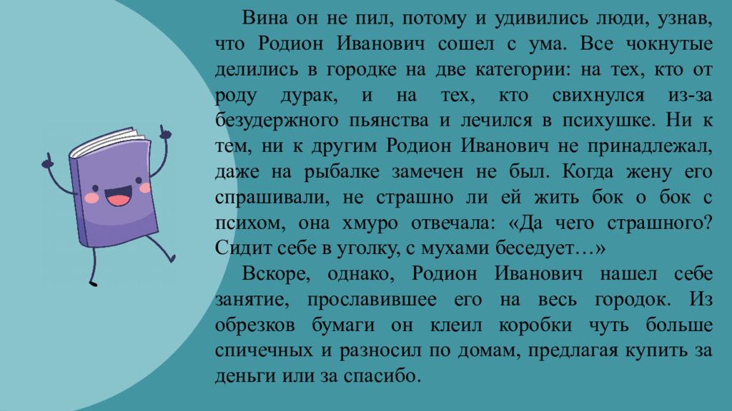 Вина он не пил, потому и удивились люди, узнав, что Родион Иванович сошел с ума. Все чокнутые делились в городке на две категории: на тех, кто от роду дурак, и на тех, кто свихнулся из-за безудержного пьянства и лечился в психушке. Ни к тем, ни к другим Родион Иванович не принадлежал, даже на рыбалке замечен не был. Когда жену его спрашивали, не страшно ли ей жить бок о бок с психом, она хмуро отвечала: «Да чего страшного? Сидит себе в уголку, с мухами беседует…» Вскоре, однако, Родион Иванович нашел себе занятие, прославившее его на весь городок. Из обрезков бумаги он клеил коробки чуть больше спичечных и разносил по домам, предлагая купить за деньги или за спасибо.