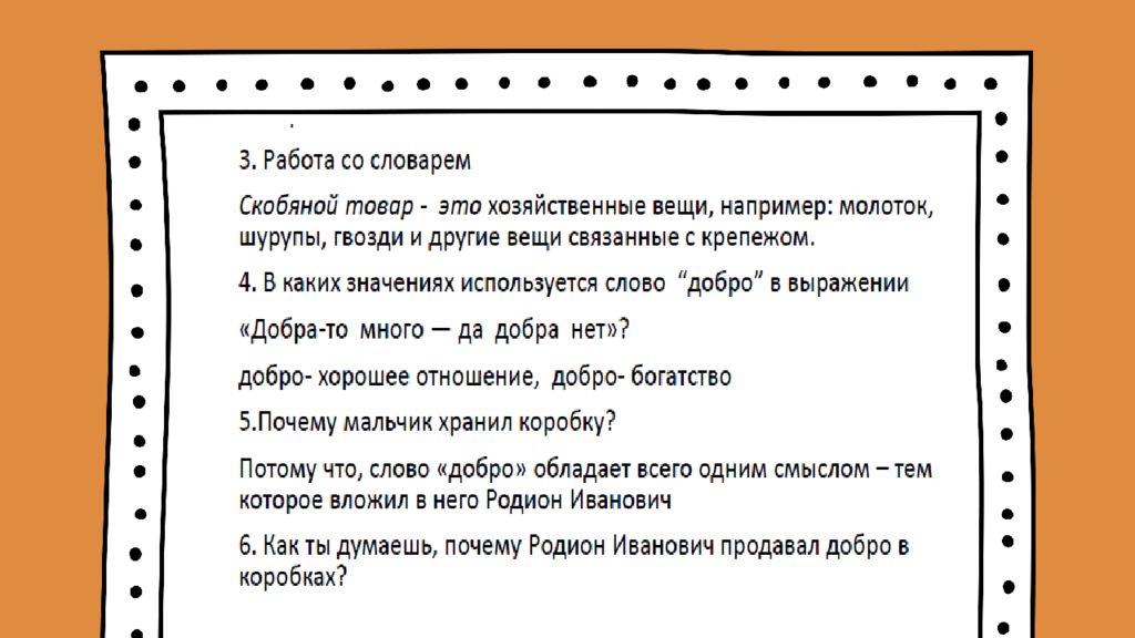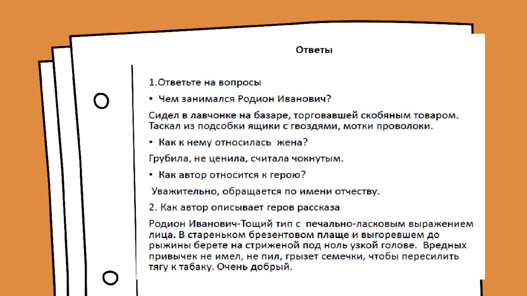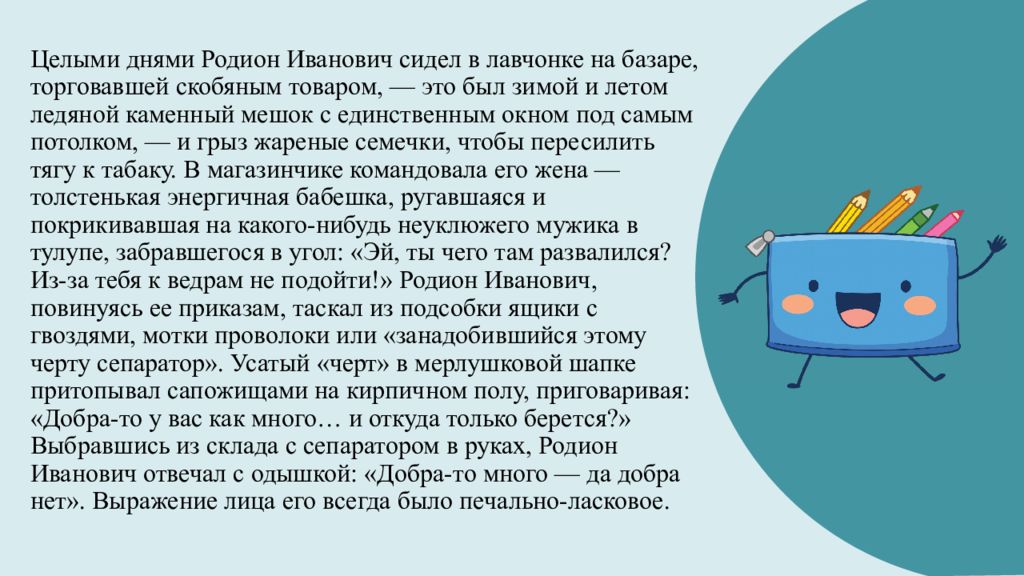 Слайд 2: Целыми днями Родион Иванович сидел в лавчонке на базаре, торговавшей скобяным товаром, — это был зимой и летом ледяной каменный мешок с единственным окном под самым потолком, — и грыз жареные семечки, чтобы пересилить тягу к табаку. В магазинчике командовала его жена — толстенькая энергичная бабешка, ругавшаяся и покрикивавшая на какого-нибудь неуклюжего мужика в тулупе, забравшегося в угол: «Эй, ты чего там развалился? Из-за тебя к ведрам не подойти!» Родион Иванович, повинуясь ее приказам, таскал из подсобки ящики с гвоздями, мотки проволоки или «занадобившийся этому черту сепаратор». Усатый «черт» в мерлушковой шапке притопывал сапожищами на кирпичном полу, приговаривая: «Добра-то у вас как много… и откуда только берется?» Выбравшись из склада с сепаратором в руках, Родион Иванович отвечал с одышкой: «Добра-то много — да добра нет». Выражение лица его всегда было печально-ласковое