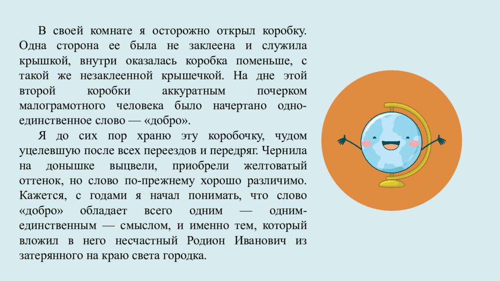 В своей комнате я осторожно открыл коробку. Одна сторона ее была не заклеена и служила крышкой, внутри оказалась коробка поменьше, с такой же незаклеенной крышечкой. На дне этой второй коробки аккуратным почерком малограмотного человека было начертано одно-единственное слово — «добро». Я до сих пор храню эту коробочку, чудом уцелевшую после всех переездов и передряг. Чернила на донышке выцвели, приобрели желтоватый оттенок, но слово по-прежнему хорошо различимо. Кажется, с годами я начал понимать, что слово «добро» обладает всего одним — одним-единственным — смыслом, и именно тем, который вложил в него несчастный Родион Иванович из затерянного на краю света городка.