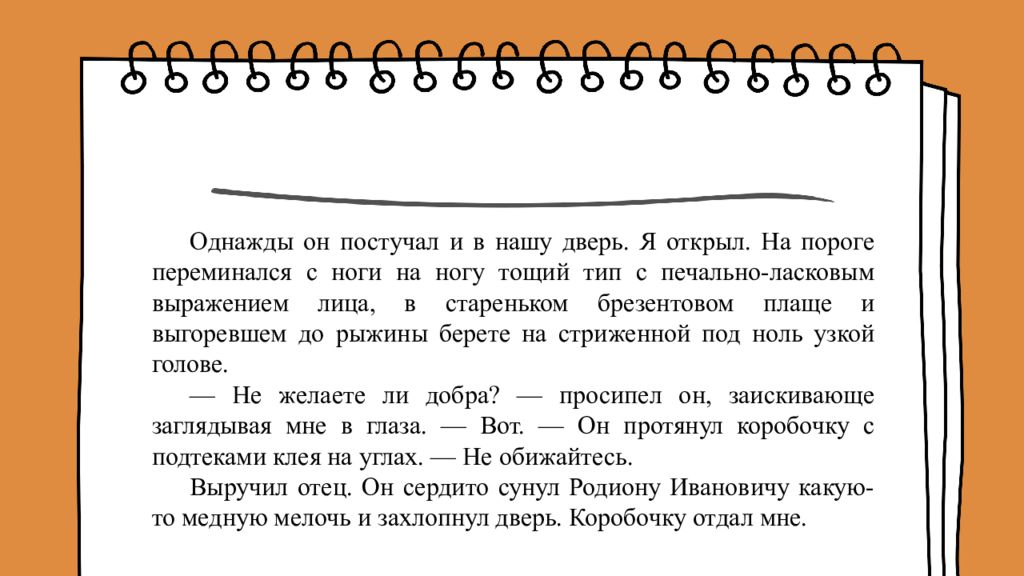 Однажды он постучал и в нашу дверь. Я открыл. На пороге переминался с ноги на ногу тощий тип с печально-ласковым выражением лица, в стареньком брезентовом плаще и выгоревшем до рыжины берете на стриженной под ноль узкой голове. — Не желаете ли добра? — просипел он, заискивающе заглядывая мне в глаза. — Вот. — Он протянул коробочку с подтеками клея на углах. — Не обижайтесь. Выручил отец. Он сердито сунул Родиону Ивановичу какую-то медную мелочь и захлопнул дверь. Коробочку отдал мне.