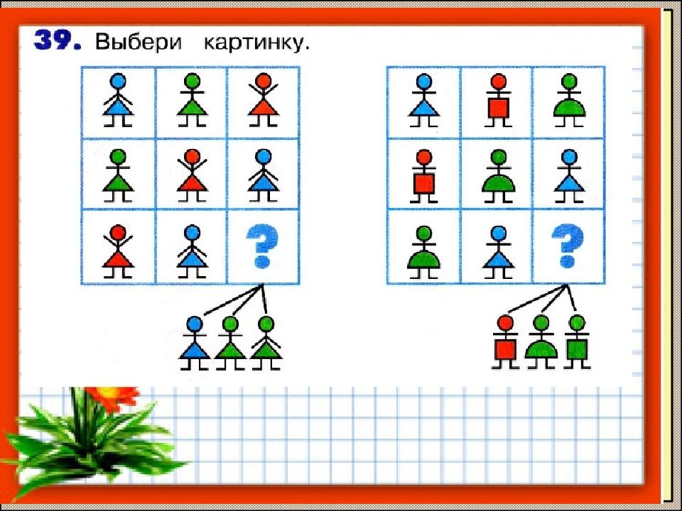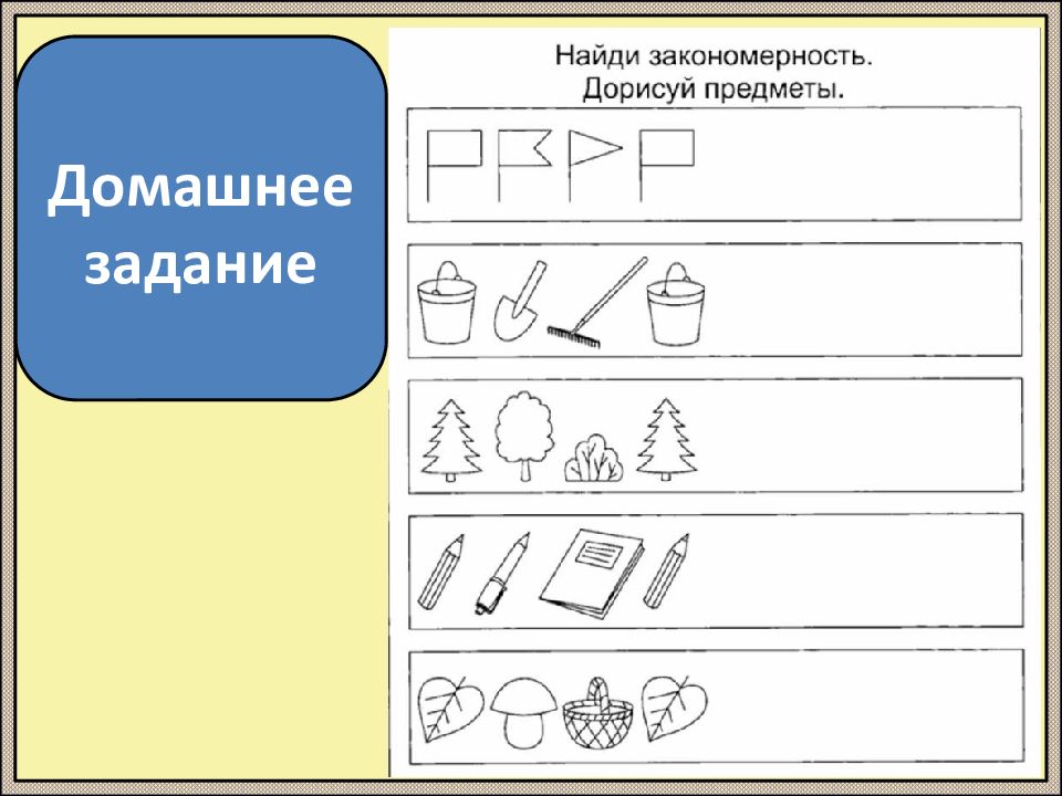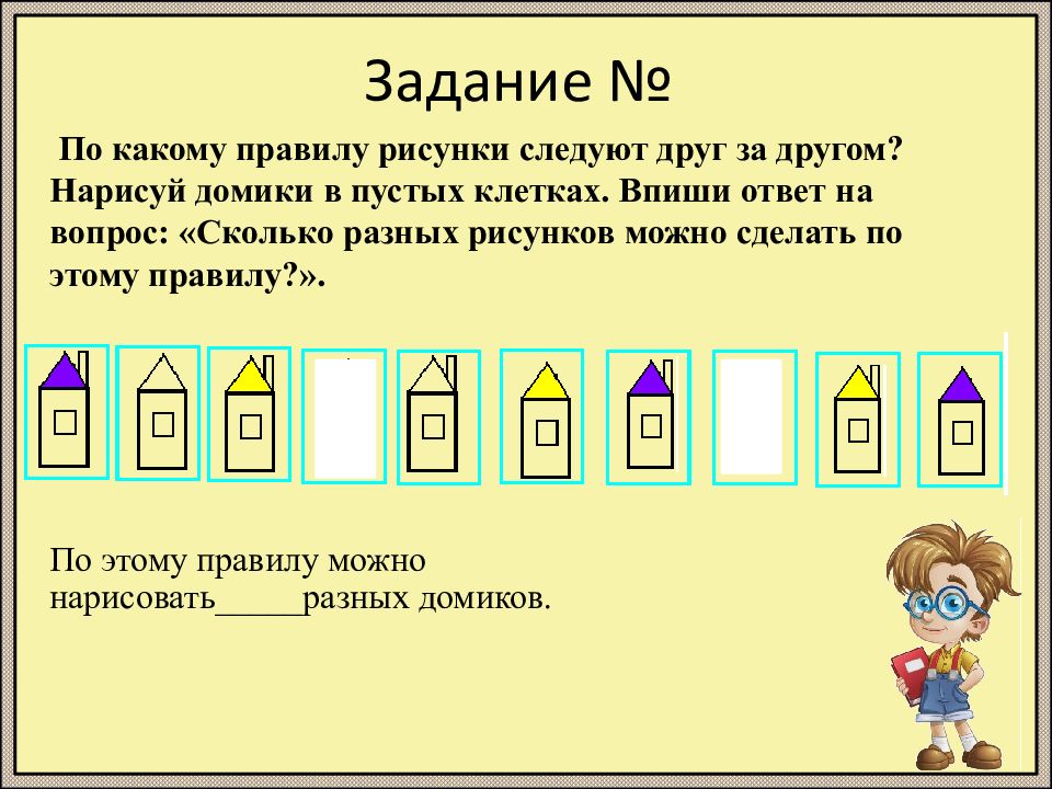 Задание № По какому правилу рисунки следуют друг за другом? Нарисуй домики в пустых клетках. Впиши ответ на вопрос: «Сколько разных рисунков можно сделать по этому правилу?». По этому правилу можно нарисовать_____разных домиков.